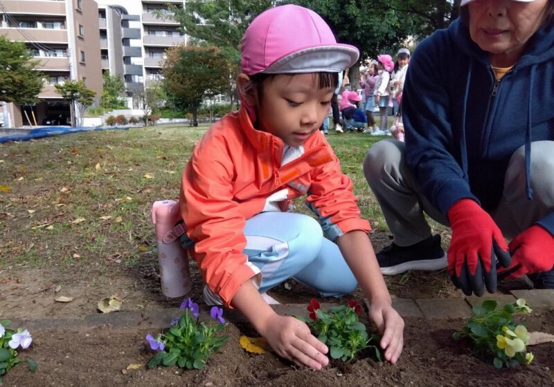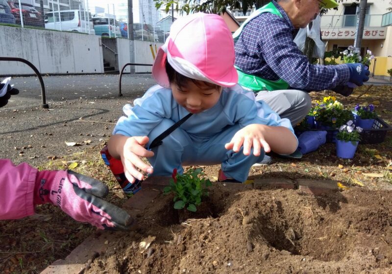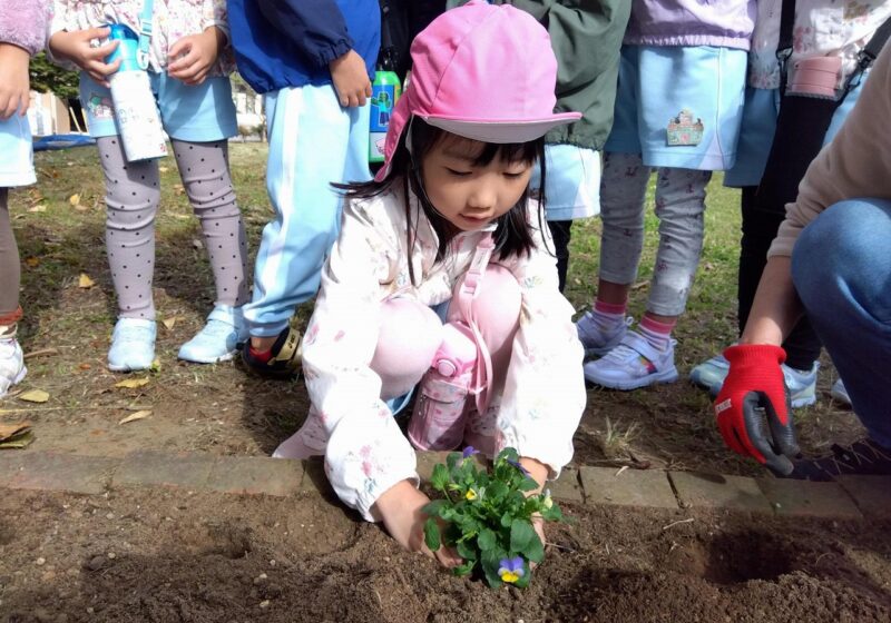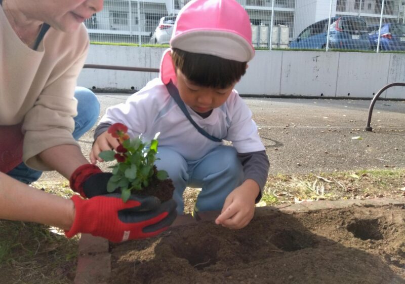 優しく土を掘って花の苗を入れ、「大きくなるかなぁ」と言いながら、優しく花を植えていました!