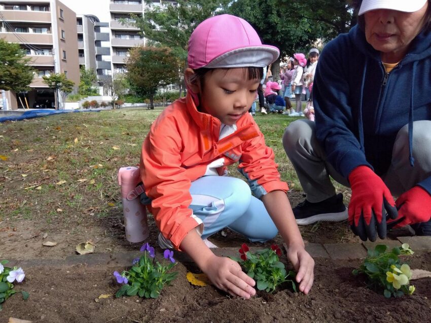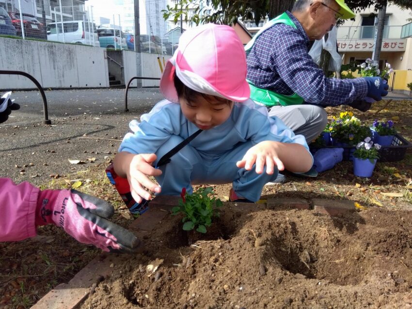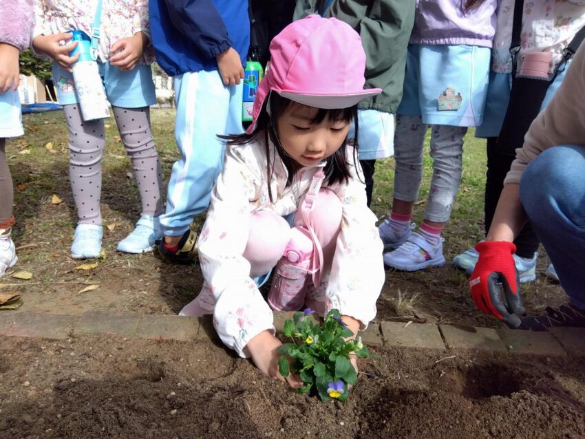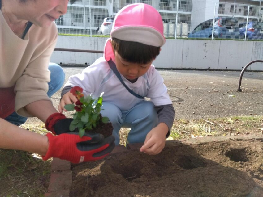 優しく土を掘って花の苗を入れ、「大きくなるかなぁ」と言いながら、優しく花を植えていました!