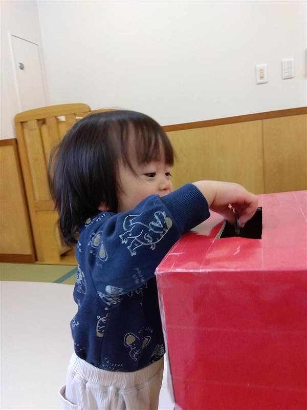 おもちゃのお賽銭をもらい、上手にお賽銭箱に入れることが出来ました!