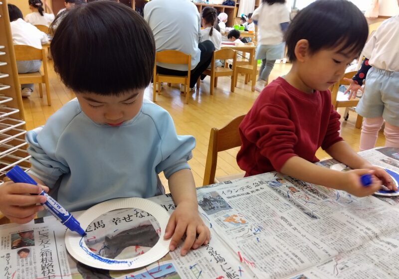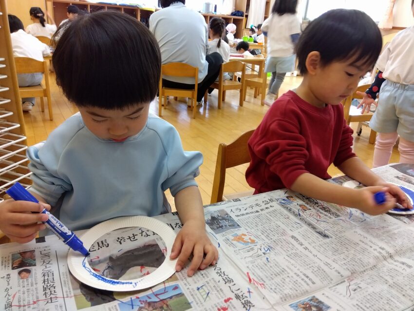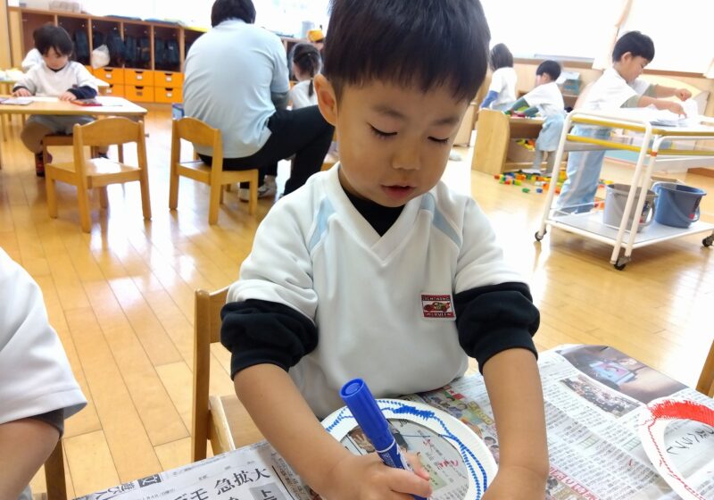 赤、青、黄色、緑の中から好きな色を選び、中心をくり抜いた紙皿にペンで色を塗りました。