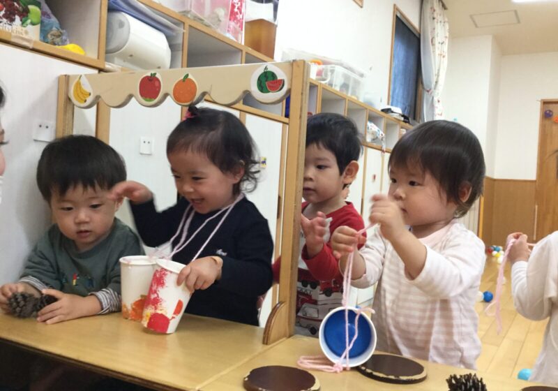 ごっこ遊びに発展し、松ぼっくり屋さんになりきって「いらっしゃいませ」と呼び込みをしていました。