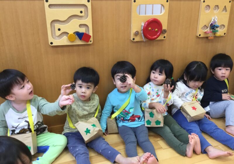 お部屋で松ぼっくり探しをすると、次々と見つけて制作したバックに入れていく子どもたち。