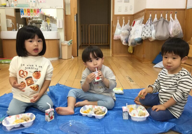 給食もレジャーシートを敷き、お弁当箱に入ったおにぎりやミートローフを食べて、普段とは違う経験をすることができました。