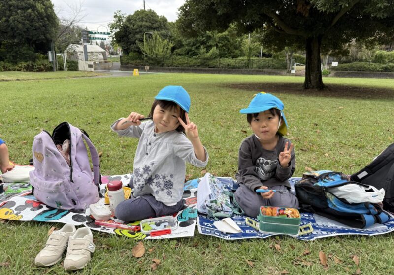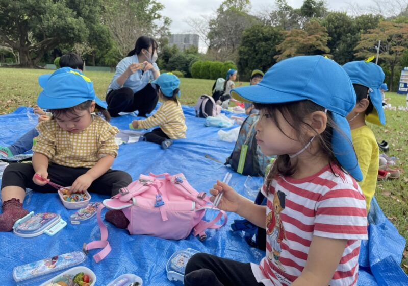 そのあとは公園でお弁当を食べました。みんなで食べるお弁当にとても喜んでいました。自分のお弁当をお友だちや先生に見せて嬉しそうに食べていました。