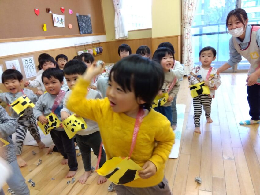 鬼が部屋に入ってくると、走って逃げ回ったり、先生の後ろに隠れたりと大騒ぎでしたが、「鬼は外!福は内!」と元気な声で豆を投げ、力を合わせて鬼を退治することができました。