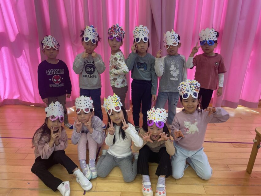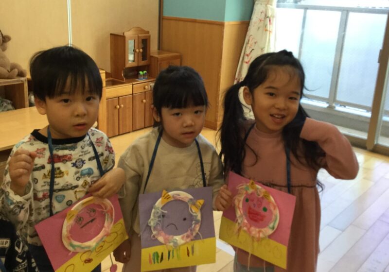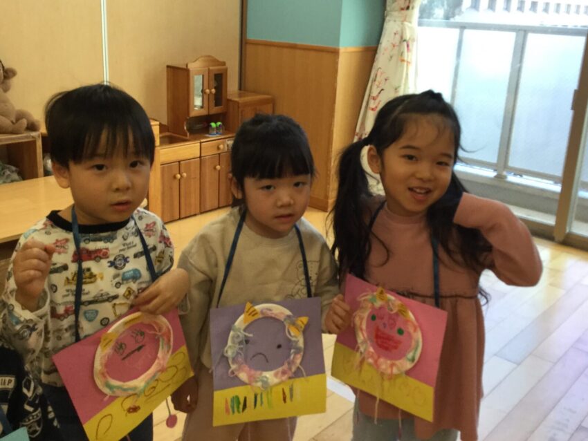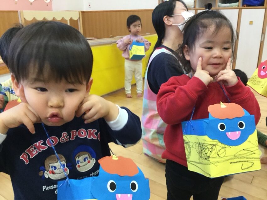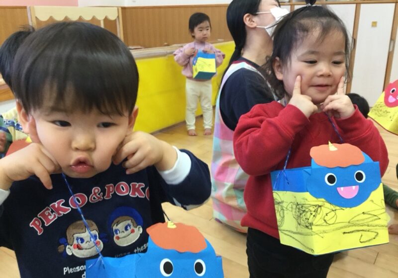 手作りの鬼のお面をつけて登場!最初は驚いた表情を見せる子どもたちでしたが、先生と一緒に「おにはそと!」と豆まきを頑張る姿が見られました。