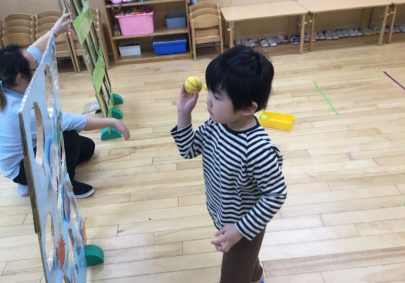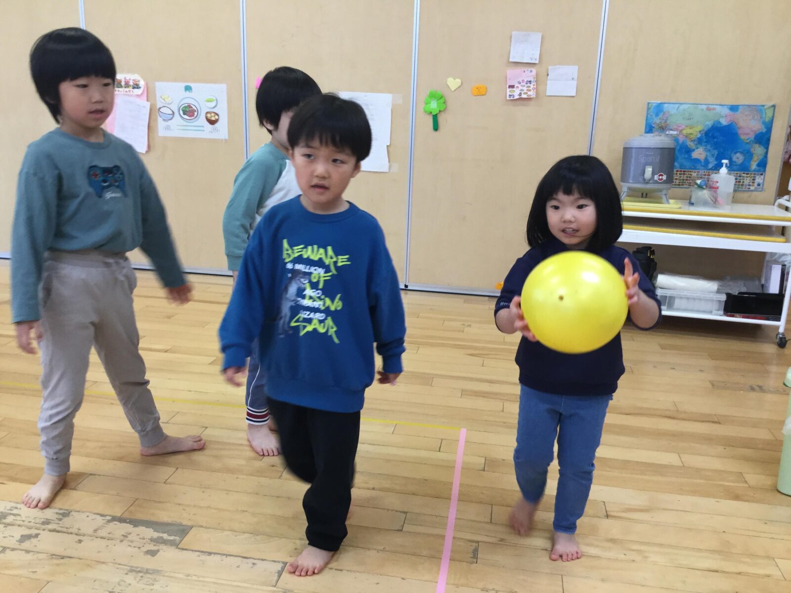 ボーリング、ストライクアウト、ドッジボールを各クラスの部屋で行っており、好きなクラスに行って様々な球技を楽しみました。