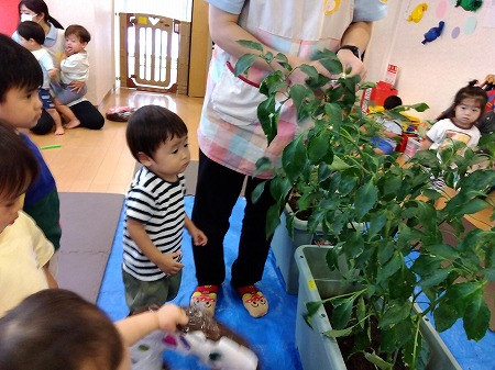 お子さまたちの水やりのおかげでピーマンとナスはたくさん実ってくれました!