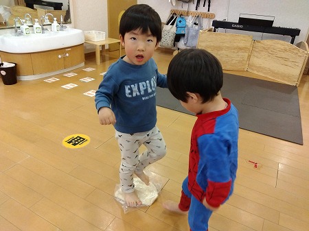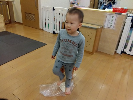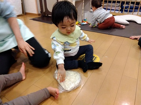 袋に入った生地を足でふみふみしたり、手でもみもみしたりしながら、感触を楽しむお子さまたち。