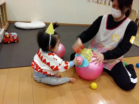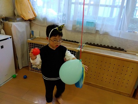 天井からぶら下がった風船オニにボールを投げてみんなでやっつけました。