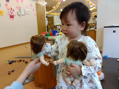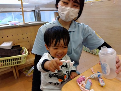 お部屋では、お気に入りのおもちゃを見つけてあそんだり、保育者と一緒にゆったりと過ごしたりと、それぞれのペースで園生活をスタートしています。