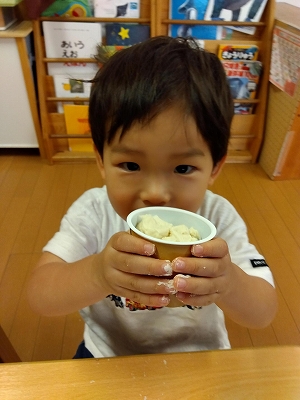 また、次の日の登園時にも「今日お団子作る?」「お月見する?」と覚えているお友だちがほとんどで、活動までの準備もスムーズに済ませることが出来ていたそら組さんです。
