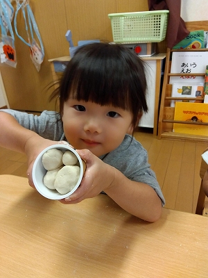 10月に入り、お月見がもう少しという事で2歳児みんなでお月見団子作りに挑戦しました!