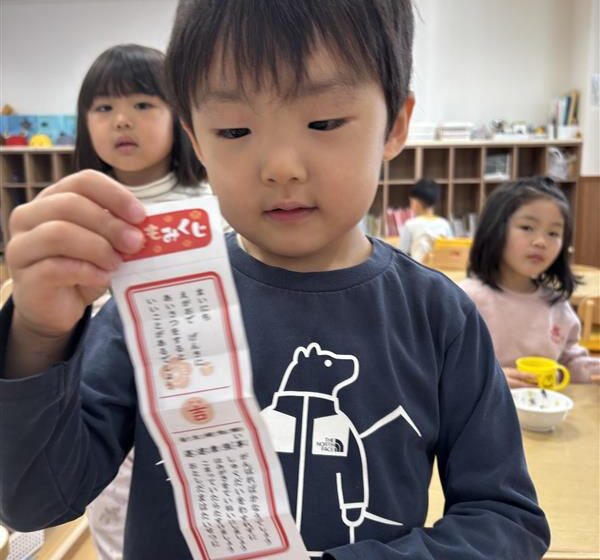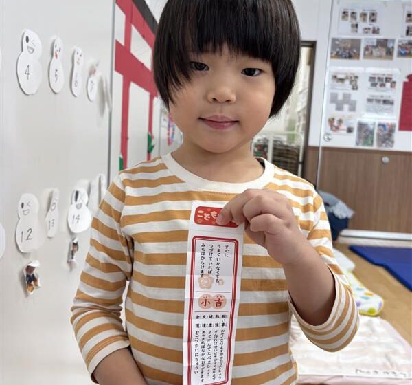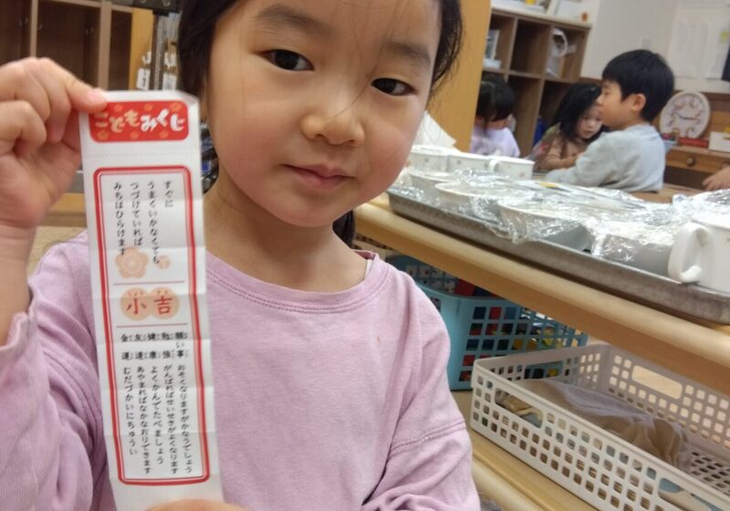 1月5日に近くの湯島天神へ行って参拝をしました。たくさんあったおみくじに興味を示し「やりたい!」とリクエストがあったので、保育園に帰り先生が作ったおみくじを引いて大盛り上がりのつき組のお友達。