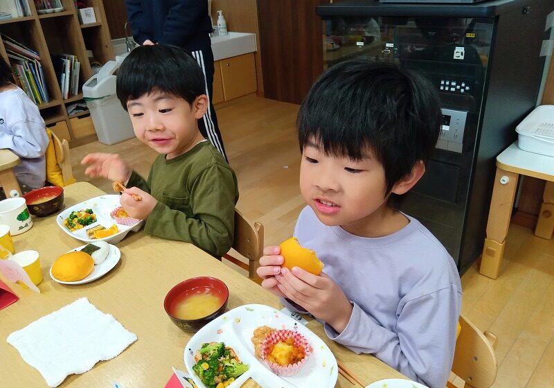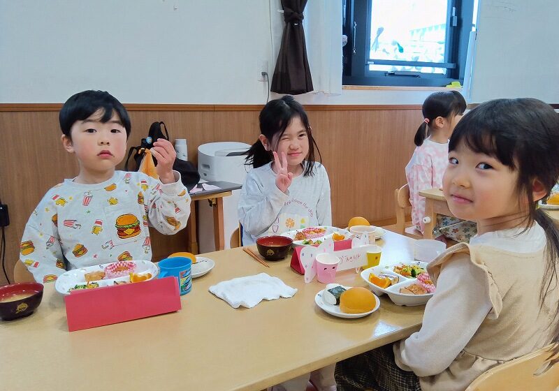 ~おわかれきゅうしょく~にじ組はつき組と一緒におわかれ給食を楽しみました。
