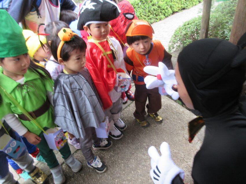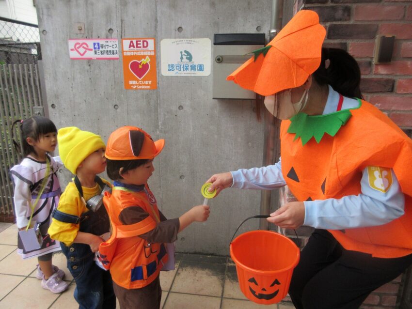 ハロウィン会では手遊びや、ハロウィンのお話の劇を見て「トリックオアトリート」の言葉も覚えてばっちりです☆