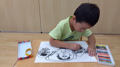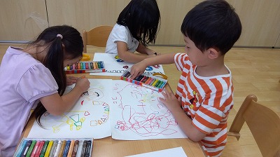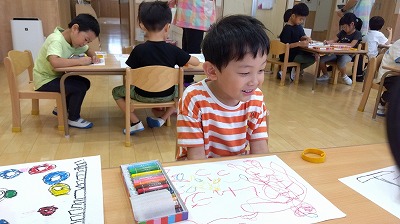 絵を描くときも「ここはこうだったよね」「リレーのバントは白だった!」「僕はね、青!」と友だちとお話をしながら、クレヨンを進める子どもたち。思い出いっぱいの絵が完成しました!