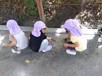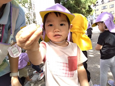 公園に着くと、松ぼっくりを見つけていたりす組さん。大きな葉っぱを見つけると「はっぱ!」「みてみてー!おっきいね!」と、ニコニコで教えてくれました。
