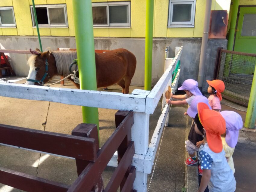 先日は、少し遠くにある上千葉公園までお散歩に出かけました。歩いている途中では、「どんな動物がいるかな?」「ポニーいるかな?」と話しながら、期待を膨らませていた子どもたち。公園に着くと、実際にポニーを見ることができ、「いた!」「かわいいね!」と嬉しそうに目を輝かせていました。