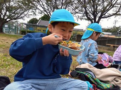 「みてみて!いいでしょ!唐揚げもあるんだよ!」「ウィンナーに顔がついてるんだぁ!」「かわいいから、食べないで持って帰りたいなぁ…」と言いながらもペロリと食べてしまうみんなでした!!