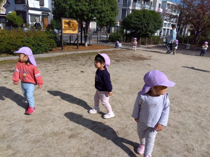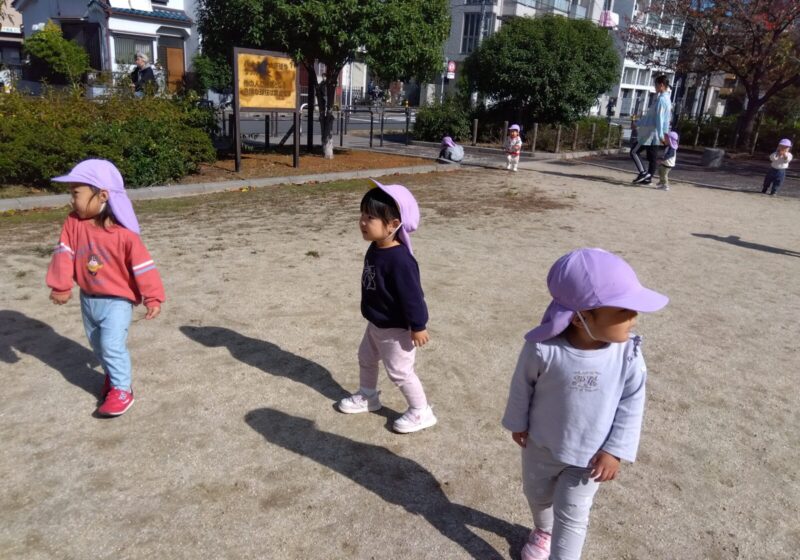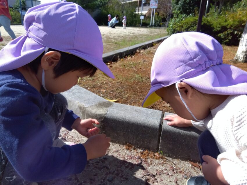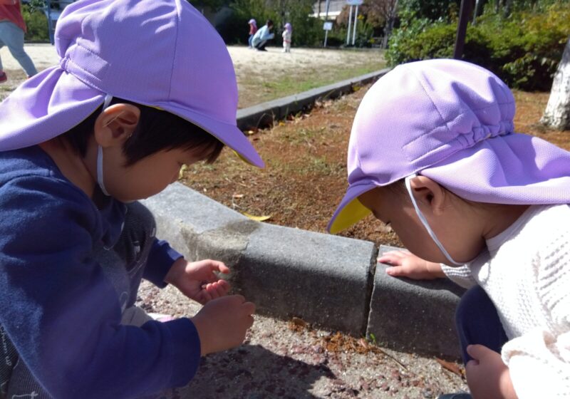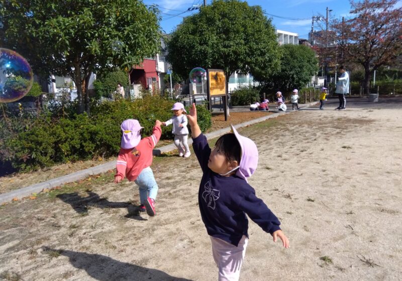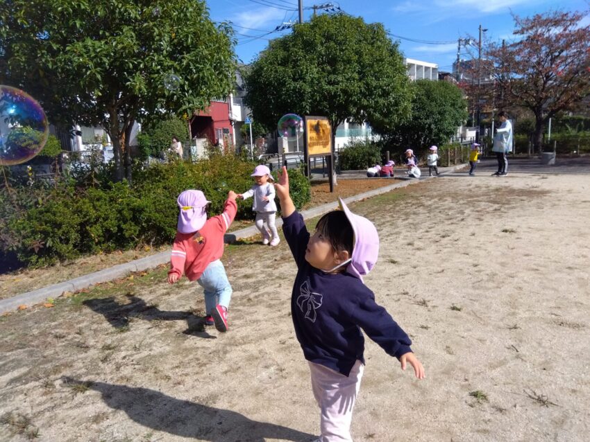 公園では、シャボン玉を飛ばすとニコニコ笑顔で追いかけたり、バッタやアリなど保育者が見つけてあげると喜んで一緒に観察したりと、秋の季節を感じながら楽しく遊んでいます。