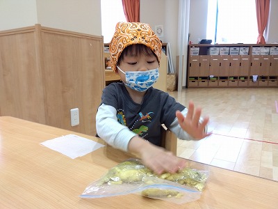 まずは、さつまいもを蒸したものを袋に入れて潰しました。「ちょっと硬いね」「楽しい!」「みんなで一緒にもみもみしよ〜!」など様々な声が聞こえ、潰すことを楽しんでいました。途中で、豆乳や砂糖を入れ、さらに揉んで混ぜ合わせた後、1人ひとつずつ、スイートポテトの形を作りました。事前に何の形を作るのか、考えてきてね!と伝えていた事もあり、「ハートにする!」「丸がいい!」と夢中になって作る姿がとても可愛らしかったです。