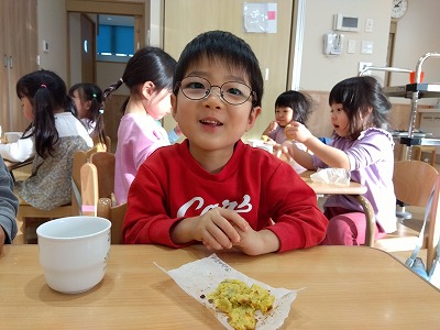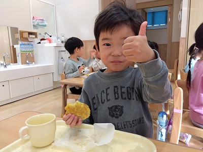 形が完成したスイートポテトは、栄養士さんに焼いてもらい、おやつの際に、食べました!自分たちで作ったスイートポテトという事もあり、もりもりといつも以上によく食べていたこあら組さんでした!
