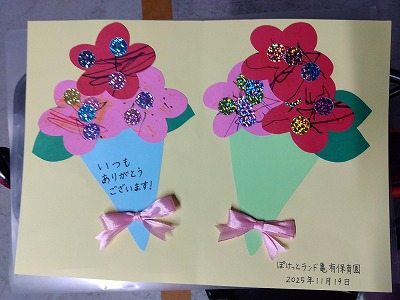 ぽけっとランド亀有保育園では、今年も普段お世話になっている方々へ、勤労感謝の日のプレゼントをしています。