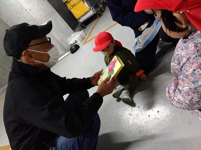 いざプレゼントを渡すとなると、終始緊張気味だったひよこ組さんでしたが、「ありがとう」の気持ちを込めて、全員揃って渡すことができました。