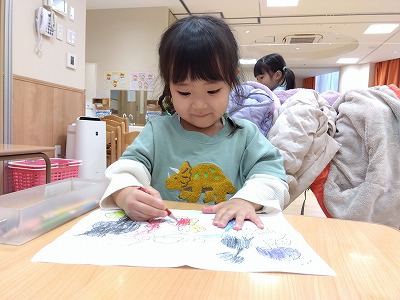 「プリンセスを塗りたい!」「ポケモンがいいな」と好きな絵を選んで集中して塗る姿を見て、また一つ成長しているなと感じました。これからも、お兄さんお姉さんに刺激をもらいながら、様々な遊びを楽しんでいけたらと思います。