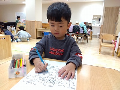 最近は、お兄さんお姉さんが「塗り絵」をしているのに興味を持ち始めていたので、色鉛筆を使用しての塗り絵を取り入れています。色鉛筆の持ち方や色の塗り方を覚え、線からはみ出さないように丁寧に塗ることが出来るように頑張っています!