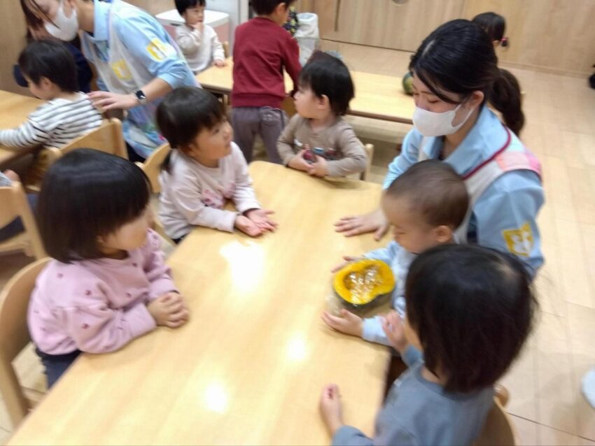 給食にカボチャが出てくると、「あまいね」「おいしいね」と話しながら、嬉しそうにもりもり食べていた子どもたち。