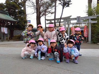 お正月ということで、近隣にある香取神社に初詣に行きました。参拝の仕方をお話しすると真剣な表情で聞いていた子どもたち。「二礼・二拍手・一礼」を上手に行うことが出来ました。
