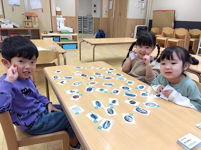また、正月遊びにも触れ、「コマ・福笑い・羽根つき・かるた・すごろく」等で実際に遊んでいます。福笑いでは、完成した顔を見るたびに「なにこのお顔!面白い!」と大爆笑をしていてとても可愛らしいです。今後も様々な正月遊びに触れ、日本の文化を知ることが出来るようにしていきたいと思います。