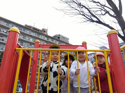 その後には、4歳児クラス、5歳児クラスと一緒に公園にお散歩に行き、鬼ごっこや大きな石の滑り台、固定遊具と関わりを楽しみながら遊んでいた子どもたちでした!