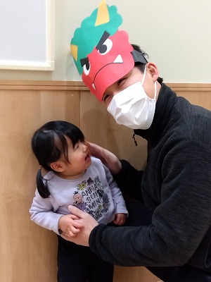 節分会に参加した後は、いよいよ豆まきをして鬼退治です。保育園に来てくれた鬼はやさしい鬼でしたが、驚いて固まっている子やお部屋の隅っこに避難して泣いている子、保育者と一緒に丸めた新聞紙を投げて果敢に鬼退治をしに行く子など様々な姿が見られました。