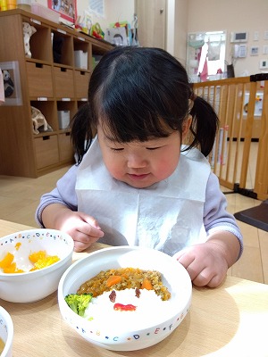 給食では、かわいい鬼さんのおにごはん(カレー)が出てきて目を輝かせながら食べていた子どもたちです。