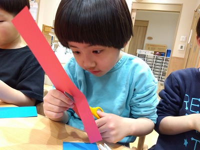 ハサミを使って線の上をはみ出さないようにしっかりと切って、千代紙で飾りつけをしてから輪になるように糊で貼り、体を作りました。その後、髪と顔も自分で描き、体と合わせて貼ることで、完成させることが出来ました。
