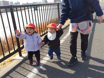 また、散歩ではお友だち同士で手を繋いで歩くことができるようになり、関わりもぐんと広がりました。言葉も少しずつ増え、保育者の肩を優しく叩いて「ねぇ、ねぇ」と話しかけたり、「せんせー」と呼んでくれたりする姿は、とても微笑ましく、心温まる瞬間です。