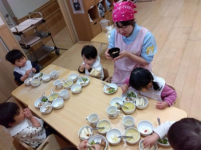 朝の会が始まることがわかると、自分から定位置に座りに行く姿が見られるようになり、日々の流れを理解して行動する力が育ってきました。給食の時間には、ほとんど保育者の援助がなくても、自分で食具を使いながら意欲的に食べ進める姿が増え、成長を感じています。