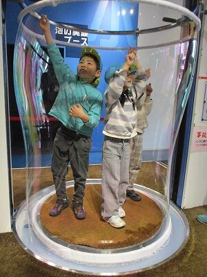 強風体験ブースでは最大風速12メートルの風を正面から受けてみたり、ポンプを使って空気を溜め、水の中に空気を放ってバブルリングを作ったり、曲がった鏡で縦長や横長に見える面白さを味わったり、大きなシャボン玉を作ってシャボンの中に入ってみたり、様々な体験をすることができました。
