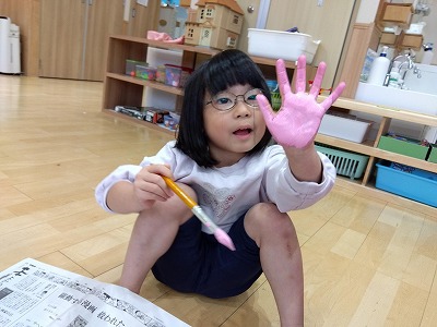 これまで絵の具で手が汚れることに抵抗を感じていた子どもたちですが、今回は躊躇することなく筆を使ったり、手に絵の具をつけたりしながら、のびのびと表現を楽しんでいました。