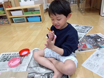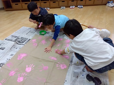 友だち同士で「見て!ピンク!」「ここに押してみよう」などと会話を弾ませながら、手形で桜の花を描く姿が見られ、クラス全体で和やかな雰囲気の中、楽しい時間を過ごすことができました。