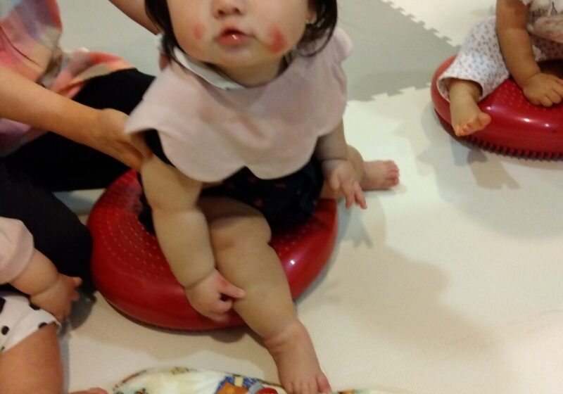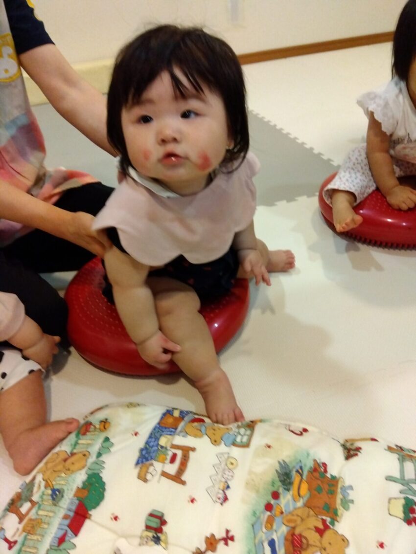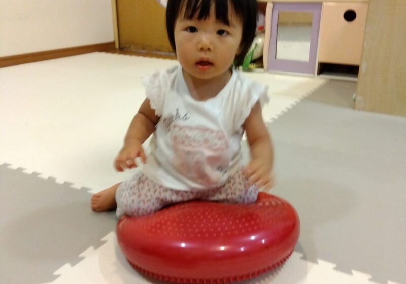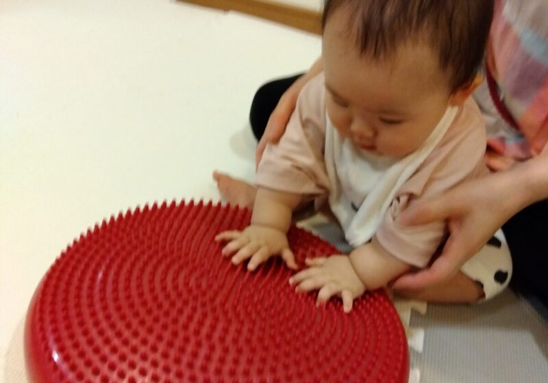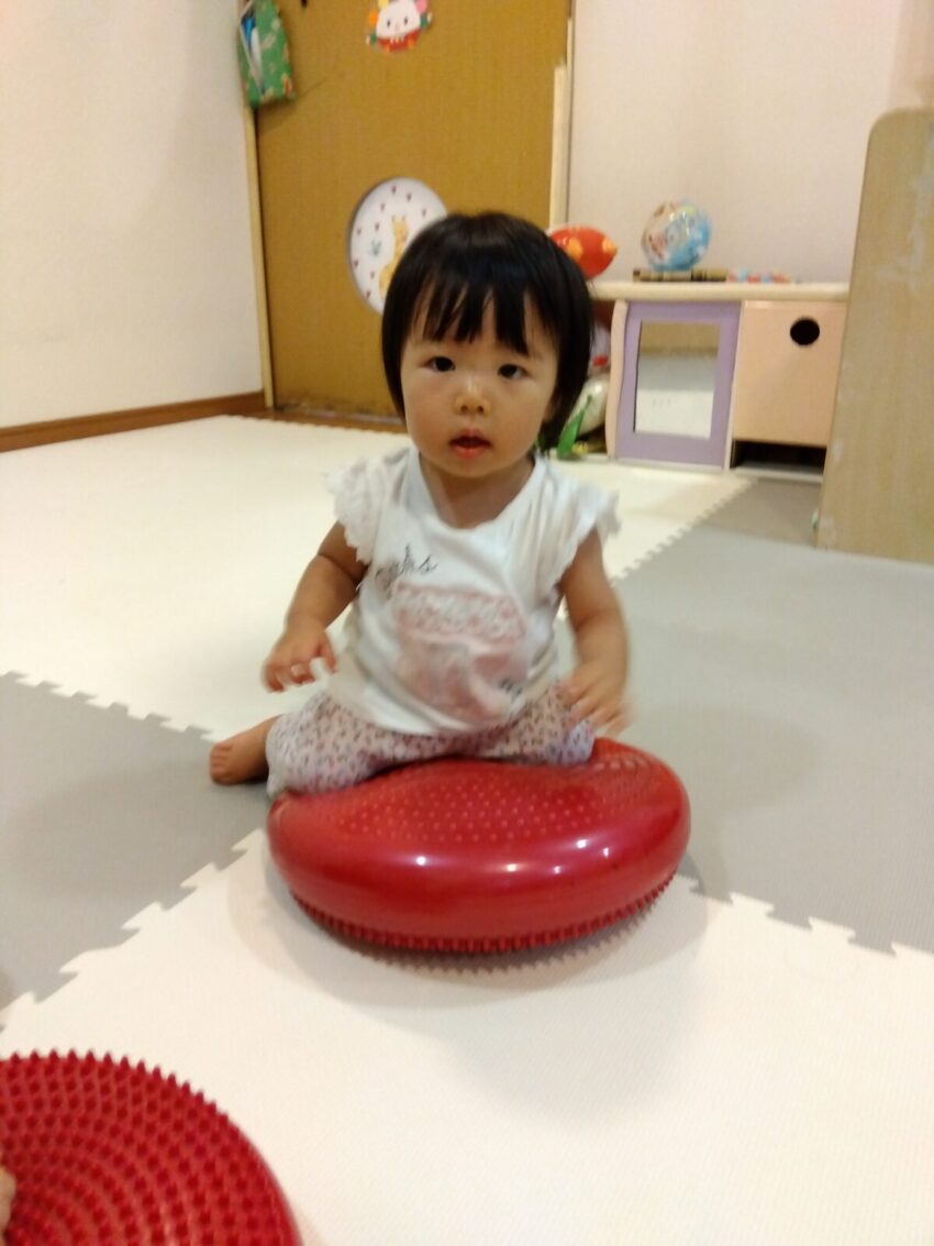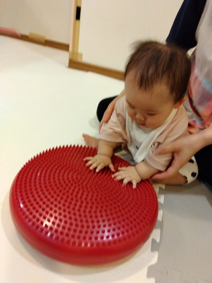 手でペチペチ叩いて感触を確かめたり、バランスクッションの上に座ったりしました。繰り返し座って遊んでいくうちに、自然と体幹が鍛えられます♪