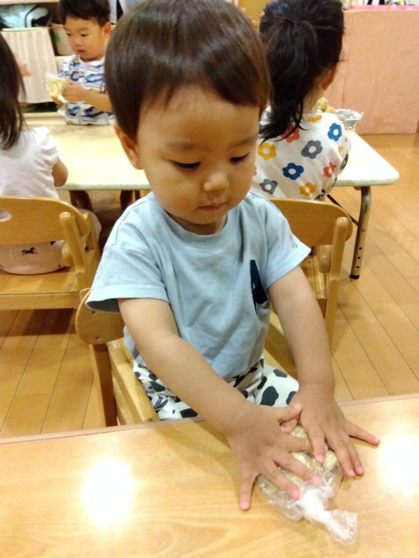 栄養士の話を聞いたり、袋に入った生地が配られると揉んだり机に置いて叩いたりしていたすぐみさんです!