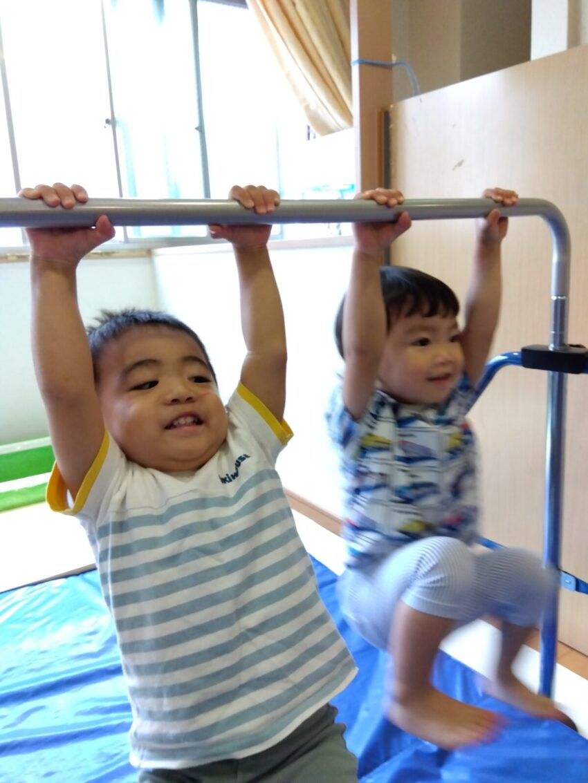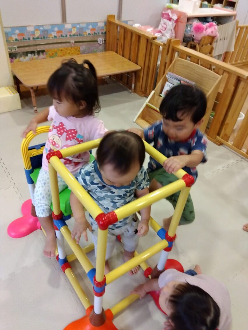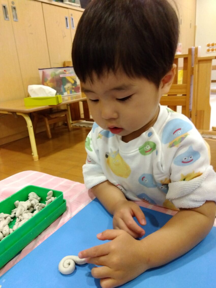 室内では、赤ちゃんのぬいぐるみをマットに寝かせたり食べ物を食べさせる真似などごっこ遊びをお友だちと楽しんだり、ジャングルジムや体操遊びなど体を動かす遊びをして遊んでいます!また、粘土遊びやお絵描きなど机上遊びも以前より集中して楽しむ姿が見られるようになってきたりすぐみさんです☆