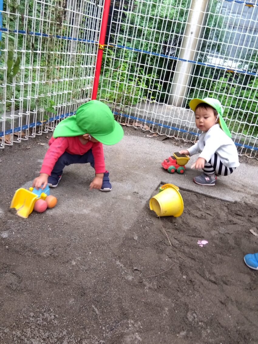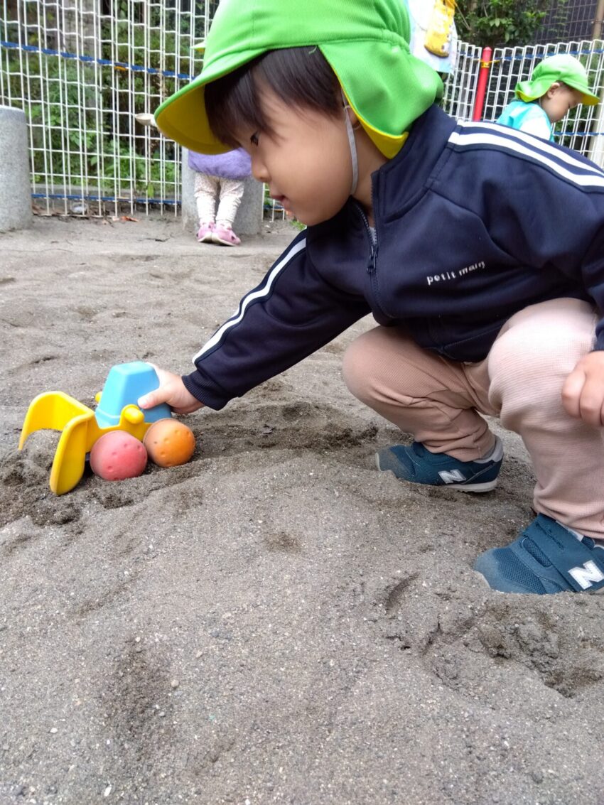 砂遊びでは、働く車をお友だちと一緒に並んで走らせたり、保育者やお友だちの所まで砂を運んで遊んだり、お山を保育者と作ったりして砂遊びを楽しんでいます。