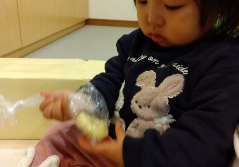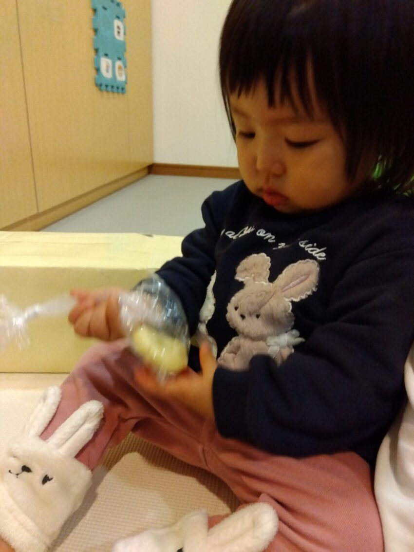 ひよこぐみのお友だちは袋の上から生地をもみもみ。