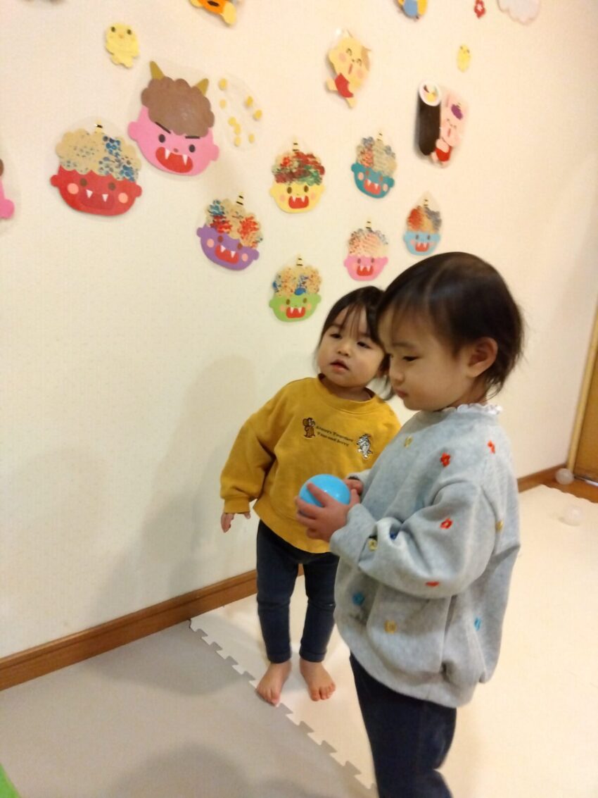 「鬼は外できた?」と聞くと頷き、もう一回!とばかりにボールを拾ってはやっつけに行っていました。