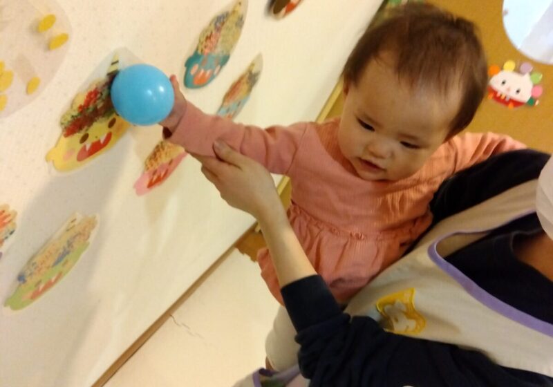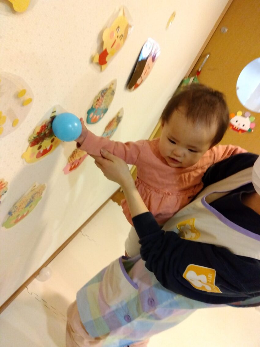 「おに~?」と興味津々な様子で、保育者が「おには~そと!」の掛け声で鬼にカラーボールを当てると真似してやっていました。